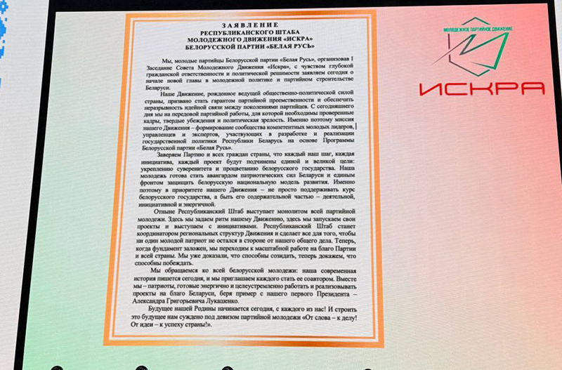 На заседании был избран лидер Молодежного движения «Искра». Им стал Ярослав Давыденко. Он подчеркнул, что сегодня молодежь осознает, что дальнейшее становление Республики Беларусь напрямую зависит от уровня гражданской ответственности и политической решимости молодых граждан. Старшее поколениепередает нам все свои победы и достижения, вверяет нам родную землю. И именно нам, молодым белорусам, быть хозяевами на своей земле, нам принимать важнейшие решения и нам определять будущее Родины. В таких условиях крайне важно чувствовать поддержку старших и единство всех поколений белорусов в борьбе за право существования нашего особого белорусского пути. И надо сказать, что сегодня мы ощущаем всю силу народного единства в стремлении белорусов жить своим умом.
