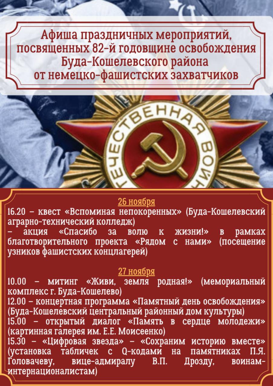Афиша праздничных мероприятий, посвященных 82-й годовщине освобождения Буда-Кошелевского района от немецко-фашистских захватчиков
