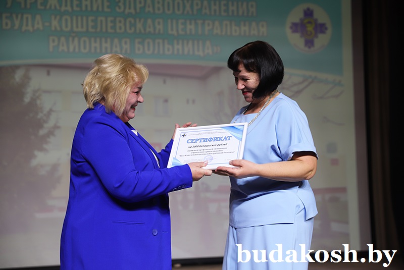 К поздравлениям присоединилась председатель Гомельской областной организации Белорусского профсоюза работников здравоохранения Надежда Зимина. Профсоюзный лидер вручила денежный сертификат первичной профсоюзной организации, нагрудной знак «За заслугі ӯ развіцці галіновага прафсаюзу» Белорусского профсоюза работников здравоохранения главному врачу Станиславу Крылатову. Благодарность Белорусского профсоюза работников здравоохранения объявлена врачу-эксперту Ольге Князевой. Медицинская сестра трансфузиологического кабинета Ольга Малашенко награждена нагрудным знаком «Ветеран профсоюзного движения» Белорусского профессионального союза работников здравоохранения, нагрудным знаком отличия «Лучший наставник» Белорусского профсоюза работников здравоохранения – врач-методист (заведующий) кабинетом медицинской статистики Сергей Корсак. Благодарность областного комитета Гомельской областной организации Белорусского профессионального союза работников здравоохранения объявлена заместителю главного врача по медицинскому обслуживанию населения Ольге Кутукиной.
