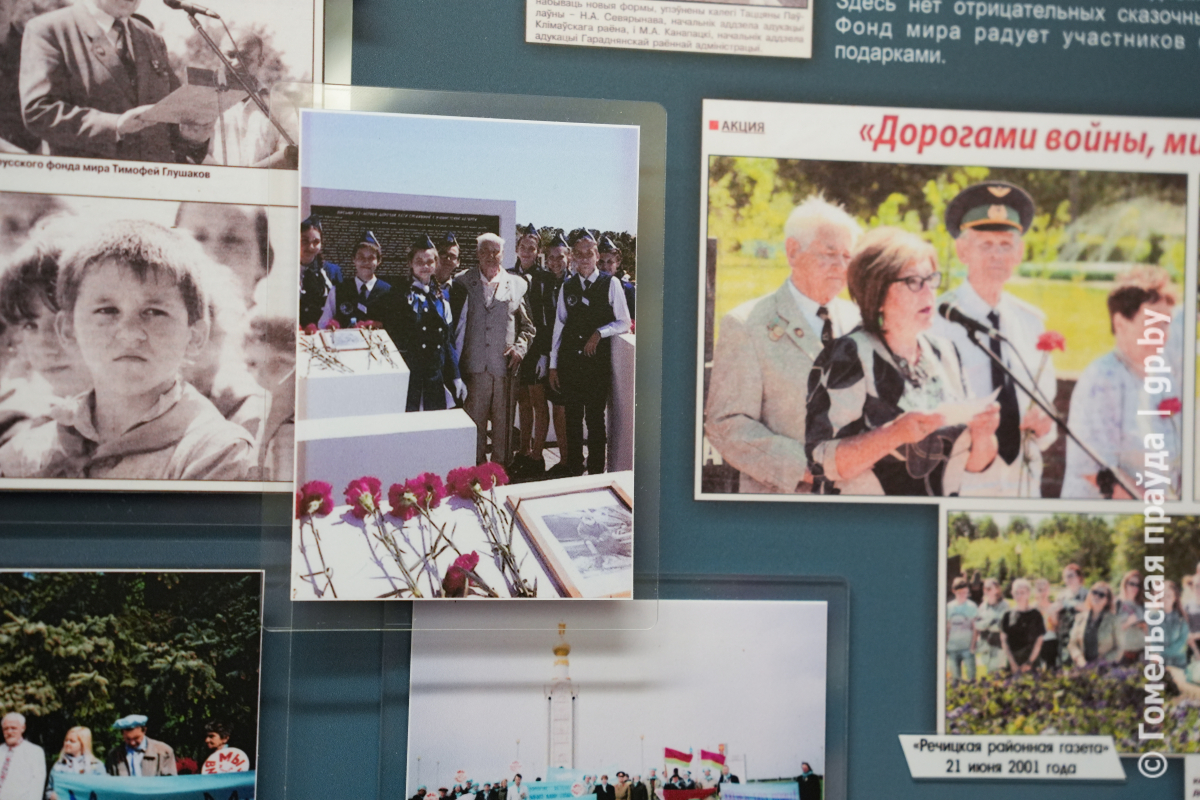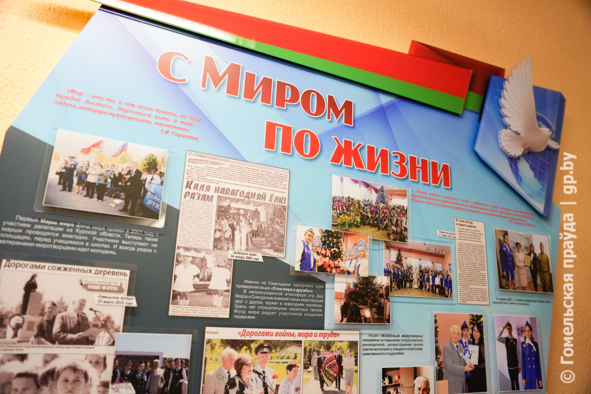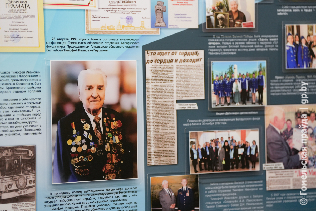 В средней школе №27 Гомеля с участием родственников посла мира открыта музейная экспозиция «Глушаков Тимофей Иванович. С миром по жизни!». Уникальные фотографии, документы, личные вещи — гости смогут больше узнать о деятельности общественника, увидеть его активное участие в миротворческих инициативах. Например, спустя всего месяц вступления в должность председателя областного отделения БФМ, он дал комментарий «Гомельскай праўдзе» о том, что успел сделать. Заметка вышла 5 ноября 1998 года — ее копия теперь тоже часть памятного уголка. Особое место занимают материалы, посвященные работе с молодежью, воспитанию у подрастающего поколения чувства ответственности за будущее планеты. Настоящей жемчужиной экспозиции стал личный дневник Тимофея Ивановича, в который он ежедневно записывал впечатления о проведенных мероприятия и выстраивал план на ближайшие несколько дней. — Тимофей Иванович Глушаков довел работу нашего отделения до совершенства. Он был замечательным человеком, гражданином, патриотом. Созданием подобных экспозиций мы с одной стороны хотим увековечить память о нем. С другой — мы считаем, что его жизненный путь должен быть примером для подрастающего поколения, примером того, как надо любить жизнь, свою страну и бороться за сохранение мира. Все, что мы сегодня делаем, было создано им, — подчеркнул в своем выступлении председатель областного отделения Белорусского фонда мира Илья Беленький. От себя лично и от всей семьи участников встречи, руководство города и области поблагодарил сын Тимофея Ивановича, Сергей Глушаков: — Отец боролся за мир во всем мире, был воспитателем для молодого поколения. Он хотел, чтобы родная Беларусь процветала, а люди созидали доброе и светлое. Пусть так и будет А мы со своей стороны постараемся оказывать всевозможную поддержку фонду во имя укрепления мира на белорусской земле. Педагоги и учащиеся школы мира отметили, что с Тимофеем Глушаковым учреждение образования связывали не только годы плодотворного сотрудничества, он был товарищем и другом, благодаря которому у школы появилась новая траектория для развития — миротворчество. Тимофей Иванович возглавлял областное отделение Белорусского фонда мира с 1998 по 2024 годы. Когда миротворческое движение начало активнее развиваться, нужен был грамотный координатор, должность председателя областного отделения предложили Тимофею Глушакову. И он согласился. Главный миротворец региона умел находить и раскрывать в каждом человеке лучшие качества. По его инициативе построена каплица с мемориальными досками пяти сожженным деревням Брагинского района, налажены связи с многими миротворческими организациями из других стран, организованы десятки патриотических акций. Обсудить с Тимофеем Ивановичем можно было любую тему, и на каждый вопрос у него было свое мнение – мудрое, четкое, емкое.
