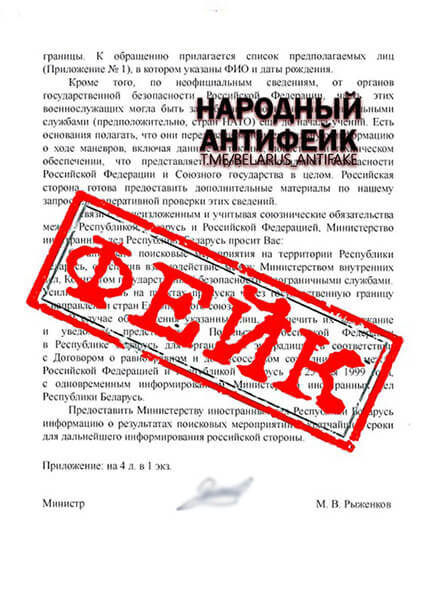 Деструктивные силы от имени Посольства РФ рассылают по организациям поддельные документы, в которых утверждается, что после завершения учения якобы не вернулись в места постоянной дислокации 13 российских военнослужащих, что они скрываются в Беларуси и планируют выезд в страны ЕС. Вброс сопровождается списком с вымышленными именами и даже намёками на «вербовку иностранными спецслужбами».