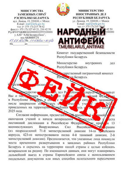 Деструктивные силы от имени Посольства РФ рассылают по организациям поддельные документы, в которых утверждается, что после завершения учения якобы не вернулись в места постоянной дислокации 13 российских военнослужащих, что они скрываются в Беларуси и планируют выезд в страны ЕС. Вброс сопровождается списком с вымышленными именами и даже намёками на «вербовку иностранными спецслужбами».