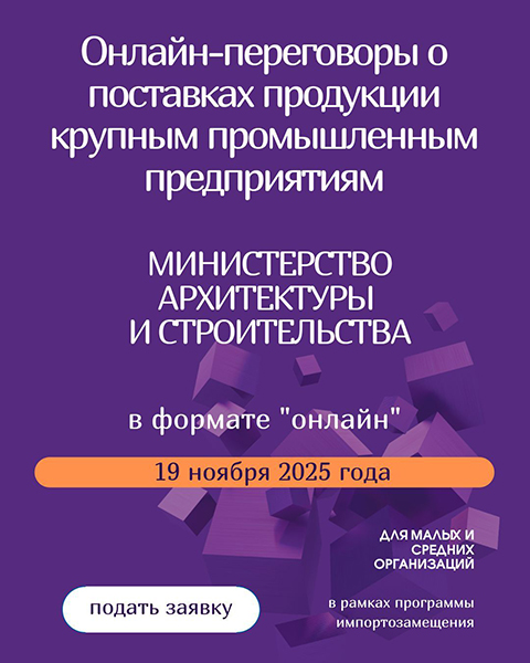 19 ноября 2025 года с 10:00 до 12:00 часов в рамках контактно – кооперационной биржи планируется проведение онлайн-переговоров с организациями Министерства архитектуры и строительства Республики Беларусь: РУП «Управляющая компания холдинга «Белорусская стекольная компания» (ОАО «Гомельстекло», ОАО «Стеклозавод «Неман», ОАО «Гродненский стеклозавод», ОАО «Белмедстекло», ОАО «Гродненский стеклозавод филиал «Елизово») и РУП «Управляющая компания холдинга «Белорусская цементная компания» (ОАО «Белорусский цементный завод», ОАО «Красносельскстройматериалы», ОАО «Кричевцементношифер»).