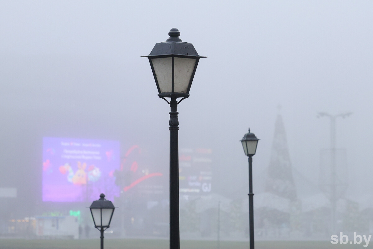 05-12-2025 Фото Александра Кулевского. Минск. Немига, Троицкое предместье. Сильный туман. Погода, природа, осень, зима, фонарь, фонари.