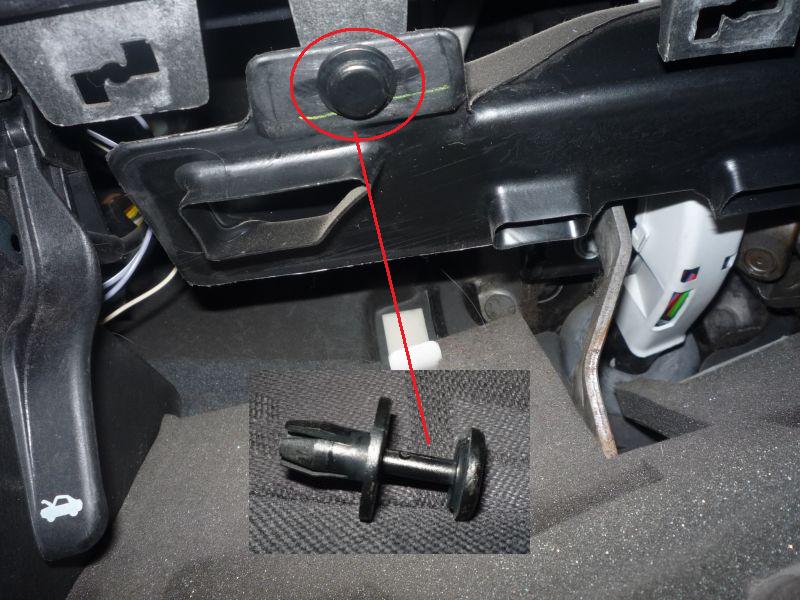 Теперь приступаем к самой трудоёмкой части — заползаем в педальный узел. Тут очень пригодится небольшой фонарик, хотя я использовал мобильник с выкрученной на максимум яркостью экрана. Отвёрткой поворачиваем на 90 градусов три чёрных заглушки и разжимаем два белых держателя нижней панели облицовки: