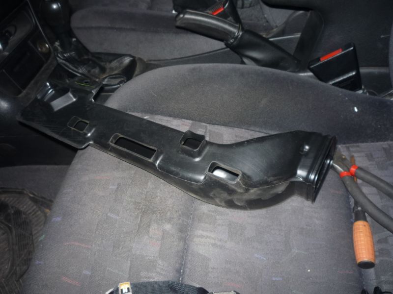Далее снимаем воздуховод: указанный «клоп» тянем плоскогубцами на себя, т.о. отсоединяем левую сторону воздуховода. Правую сторону просто руками вытаскиваем из соединения.
