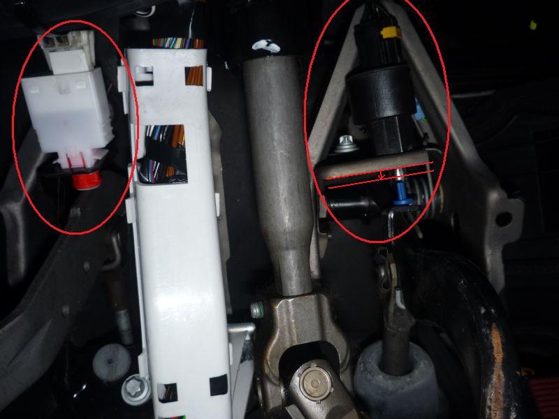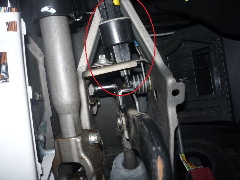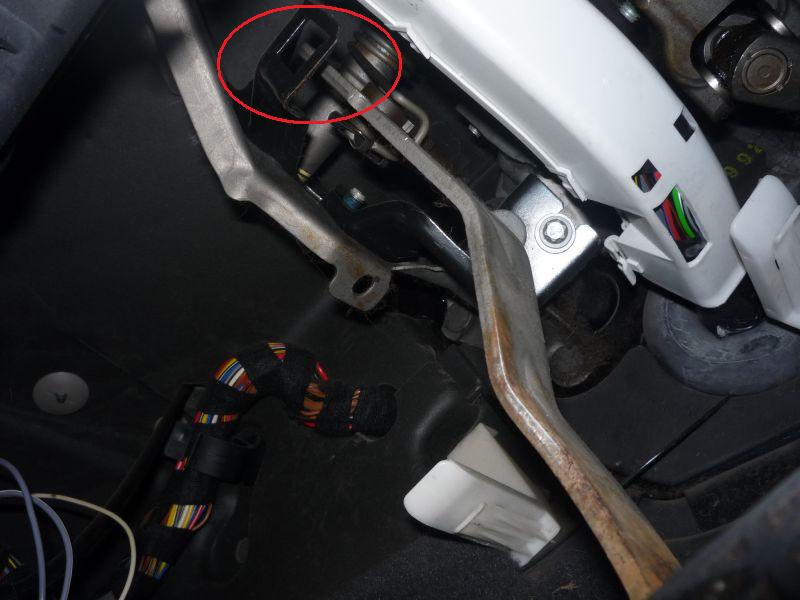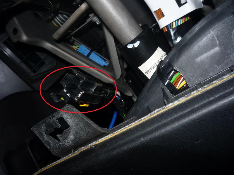 Далее залезаем головой в педальный узел, лицом вверх. Для удобства отодвигаем сиденье до упора назад, а руль поднимаем в верхнее положение. Нижеприведённые фотографии сделаны именно так — объективом вверх. Лягушки расположены так, что их разъёмы расположены со стороны салона, а их кнопки — со стороны двигателя.