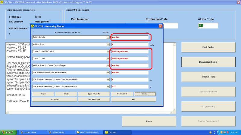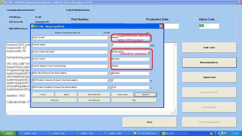 И ещё: если в Opcom выбрать Vectra B -> Chassis -> Cruise Control, то, скорее всего, никакого подключения не произойдёт, т.к. судя по всему, этот раздел для подключения в отдельному блоку круиза, т.е. на машинках с механической педалью газа. На наших же машинках все данные круиза отображаются в Engine -> Measusring Blocks.
