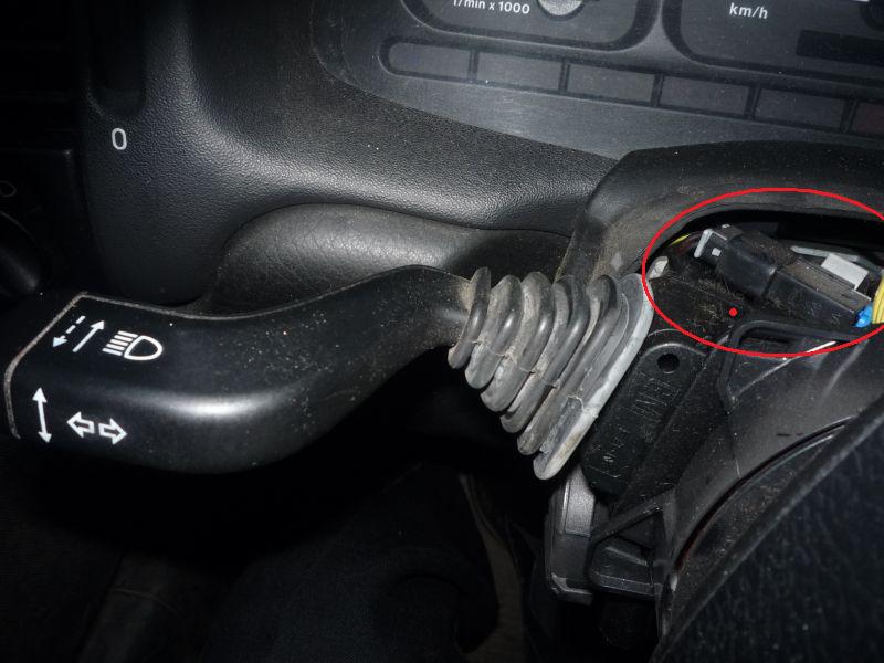 Убеждаемся в наличии маленького свободного разъёма, закрытого заглушкой (обведён кружком на фото). Снимаем заглушку (закреплена защёлкой). Вытаскиваем подрулевой переключатель, сжав защёлки сверху и снизу (верхняя защёлка помечена красной точкой на фото). Отсоединяем разъём переключателя (две защёлки).