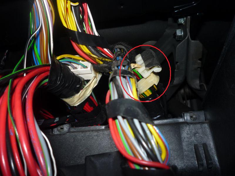 За блоком предохранителей находим свободный разъём для лягушки сцепления — на фото в кружке. Снимаем с него изоленту и отводим в сторону педали сцепления.