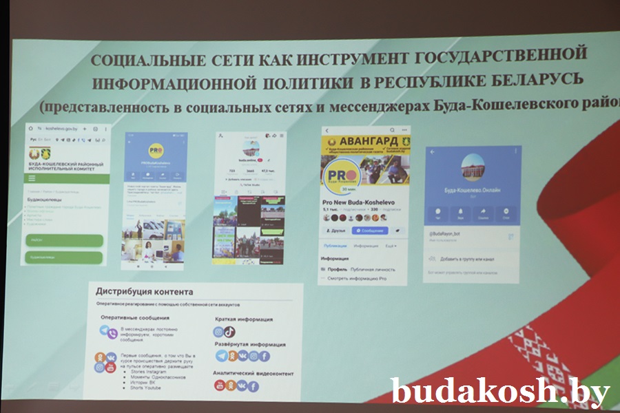 Главный специалист отдела идеологической работы и по делам молодежи райисполкома Марина Агажельская отметила, что социальные сети в Беларуси служат инструментом как для информационной политики, так и представляют угрозу информационной безопасности. С одной стороны, они позволяют распространять информацию и могут использоваться для мобилизации сторонников и продвижения социальных или политических движений, а также для формирования общественного мнения. Анализ данных в свою очередь помогает понять, как пользователи взаимодействуют с информацией и какой контент вызывает наибольший отклик. Но с другой стороны, ставят под угрозу безопасность граждан из-за рисков, связанных с утечкой личных данных и распространением дезинформации. Постоянное потребление контента из социальных сетей может приводить к снижению критического мышления, так как люди склонны принимать информацию за чистую монету, не подвергая ее сомнению.
